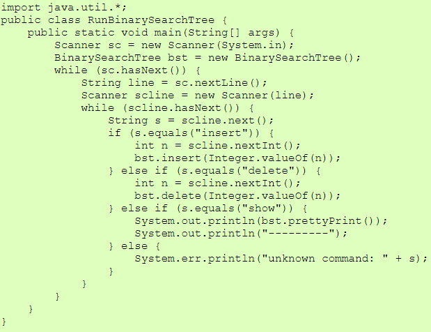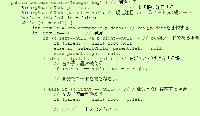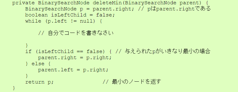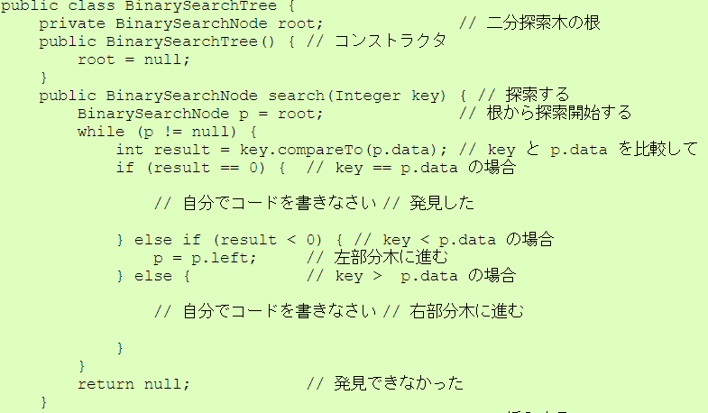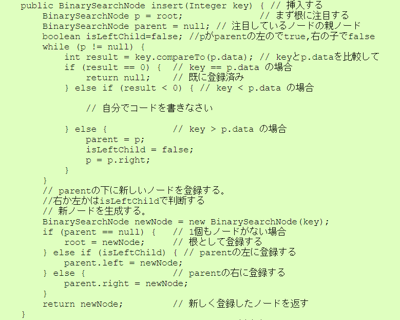 BinarySearchTree.java の欠けている部分を自分でコードを書きなさい。