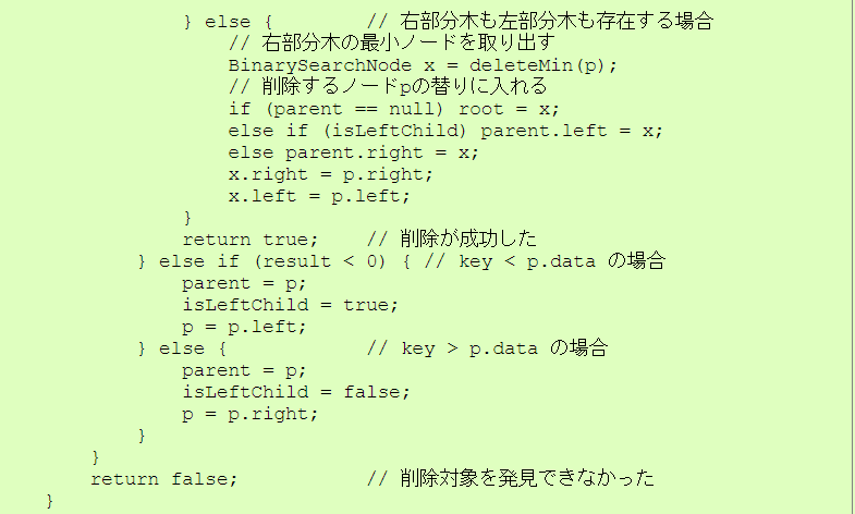基本は「keyがノードより小さければ左部分木へ、大きければ右部分木へ」 と処理をする。 左右両方の部分木をもつノードの削除だけが少し考え方が難しいが、 「『右部分木の最小のもの』(これは、『削除するノードの次に大きいノード』 を意味する)を探してきて、削除するノードと置き換え」ればよい。 もちろん、 「『左部分木の最大のもの』(これは、『削除するノードの次に小さいノード』 を意味する)を探してきて、削除するノードと置き換え」ても構わないのだが。