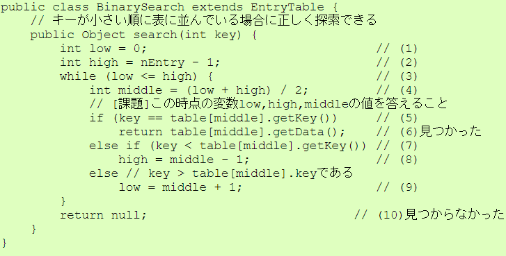 BinarySearch.javaを提出して下さい。 ただし、提出する際のコメント欄には各質問に対する上記の考察の 結果を記述すること。