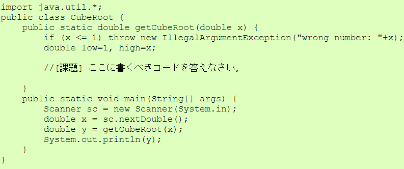 | コメント欄: | CubeRoot.javaに2, 8, 100, 1000, 123456789を入力として与えたときのそれぞれの出力 |
