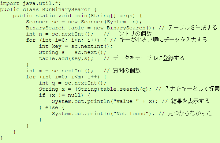 RunBinarySearch.java を動作させて下さい。 Entry.java, EntryTable.java, BinarySearch.java, RunBinarySearch.java が必要となります。