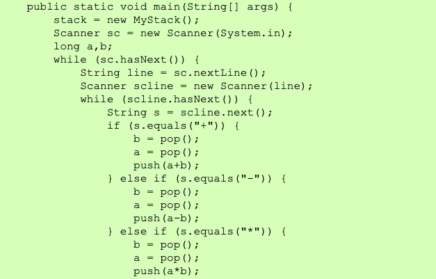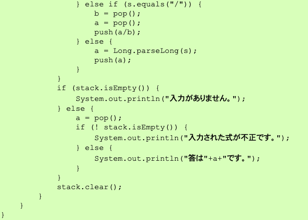 Calculator.java を次のデータに対して動作させて下さい (注意: Calculator.javaの実行にはMyStack.javaも必要です)。