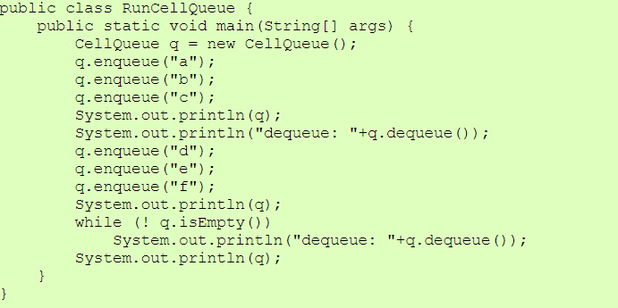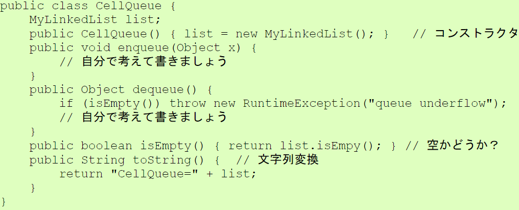 一方向の連結リストを内部表現として用いて、キューを表現する
