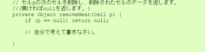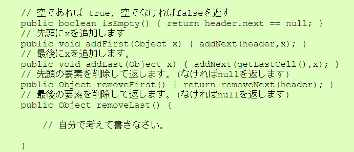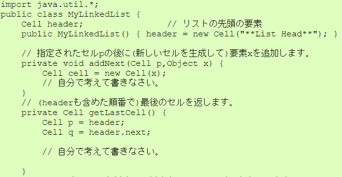 「連結リスト」のクラスである MyLinkedList.java を作成しなさい。