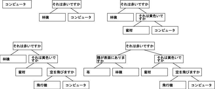 2分木のLeafノードに物の名前を入れ、非終端ノードに質問を記憶するものとにする。