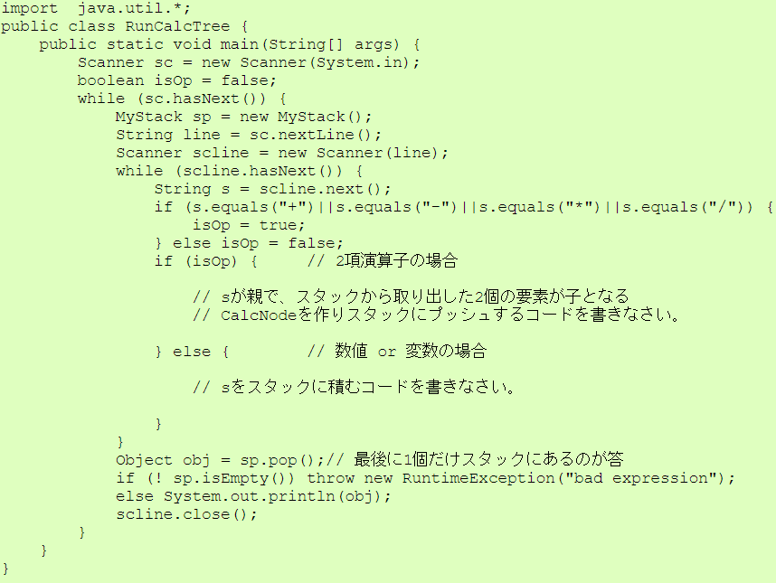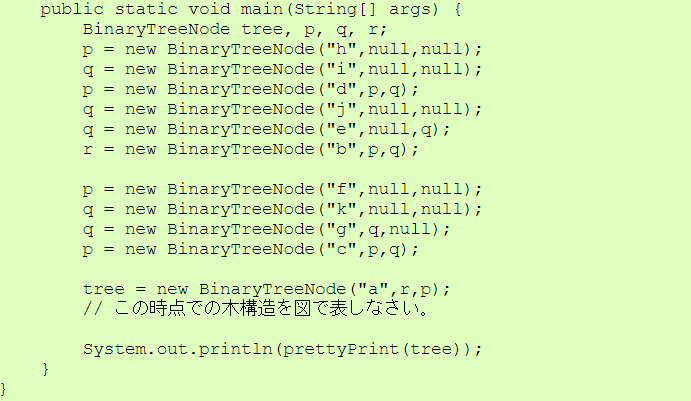 以下のプログラムを実行したとき、treeにはどのような木構造が保持されるのか、図で表しなさい。提出するファイルの形式はjpg, gif, png, pdfのうちのどれかとすること。