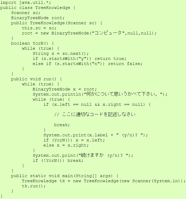 2分木で知識を表現するプログラム TreeKnowledge.java を作成しなさい。