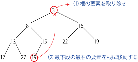根を取り除くには、「最下段の最も右の要素」を根の場所に移動して、 あとは2つの子ノードのうち小さいものと入れ替えて行けばよい。