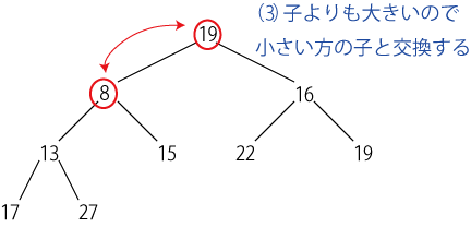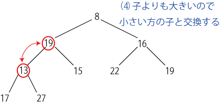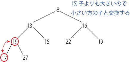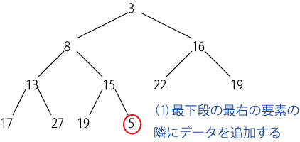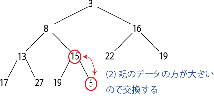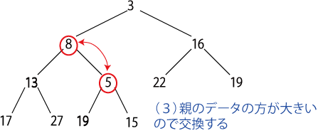 新しいデータを挿入するには、「最下段の最も右の要素」として挿入した後、 親ノードの方が大きい限り交換してゆく。