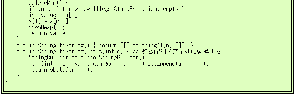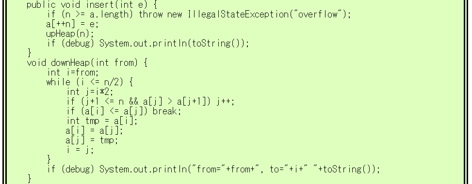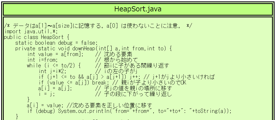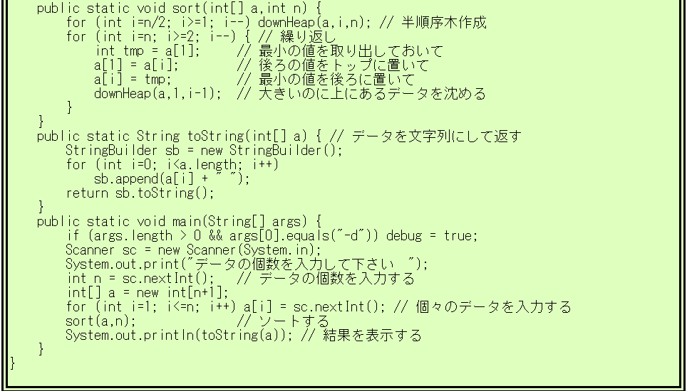 [添字が0の場所は使いません。そのためa[0]は0のままです] % javac HeapSort.java |