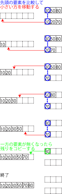 a:{30,50,80}, b:{10,20,70}という2つのデータ列から マージ操作によって新しいデータ列cをつくり出すときの 動作を以下の図に示します。