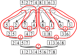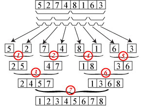 [1] データ列を真中で2つの部分列aとbに分割する。 [2] 部分列 a と b をそれぞれ整列する。 [3] 整列済みになった部分列 a と b をマージする。 |