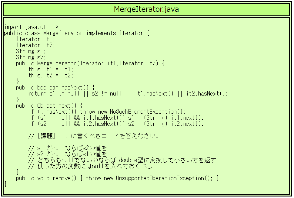 MergeIterator.javaの中の欠けている部分のコードを自分で書いて下さい。