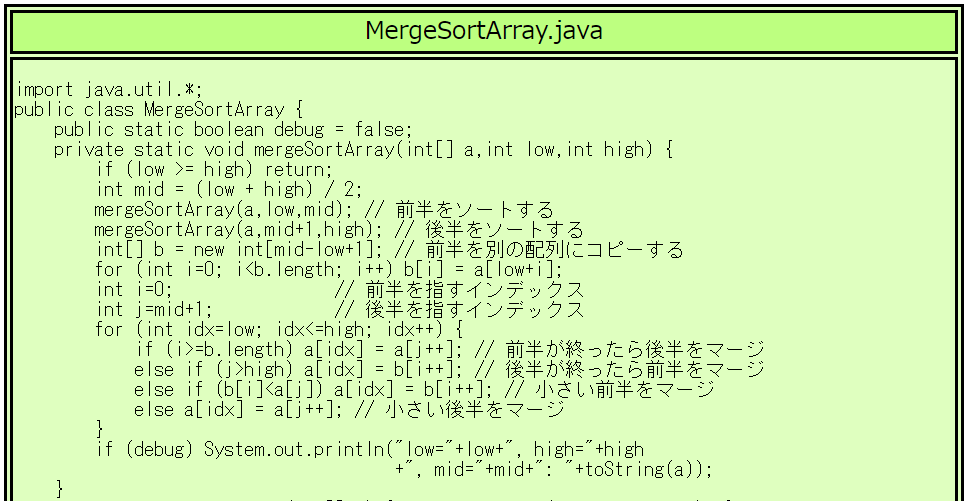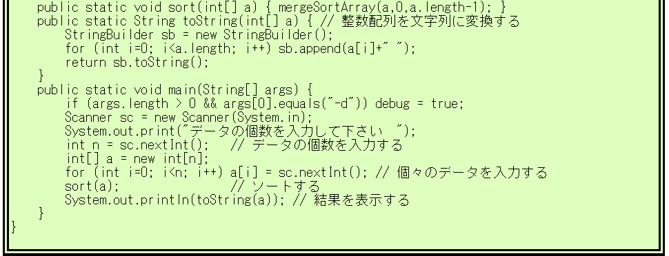 | MergeSortArray.javaの実行例 |