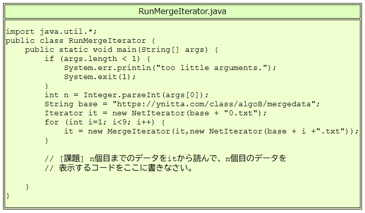 これら全体を通して小さい方からn番目のデータを表示する プログラム RunMergeIterator.java, MergeIterator.java, NetIterator.java を考えます。