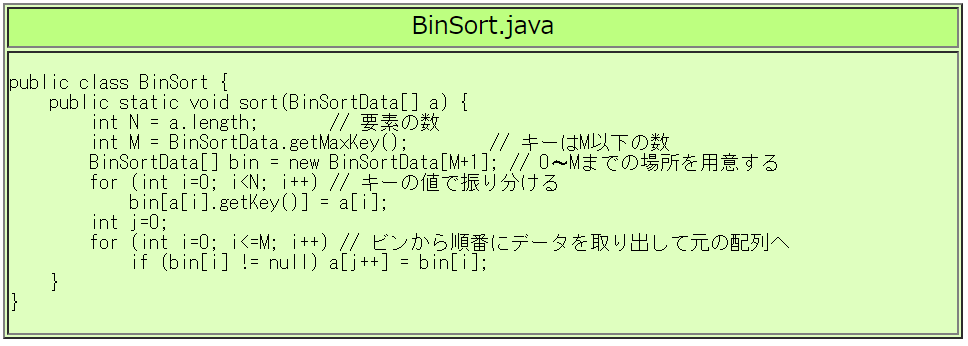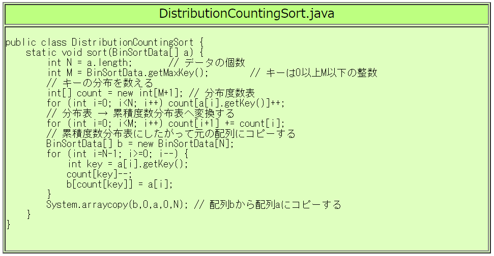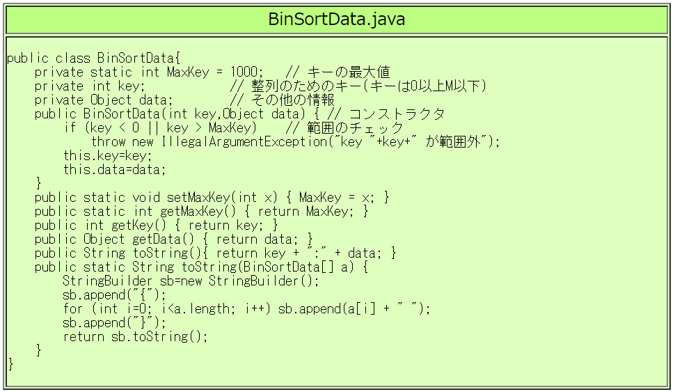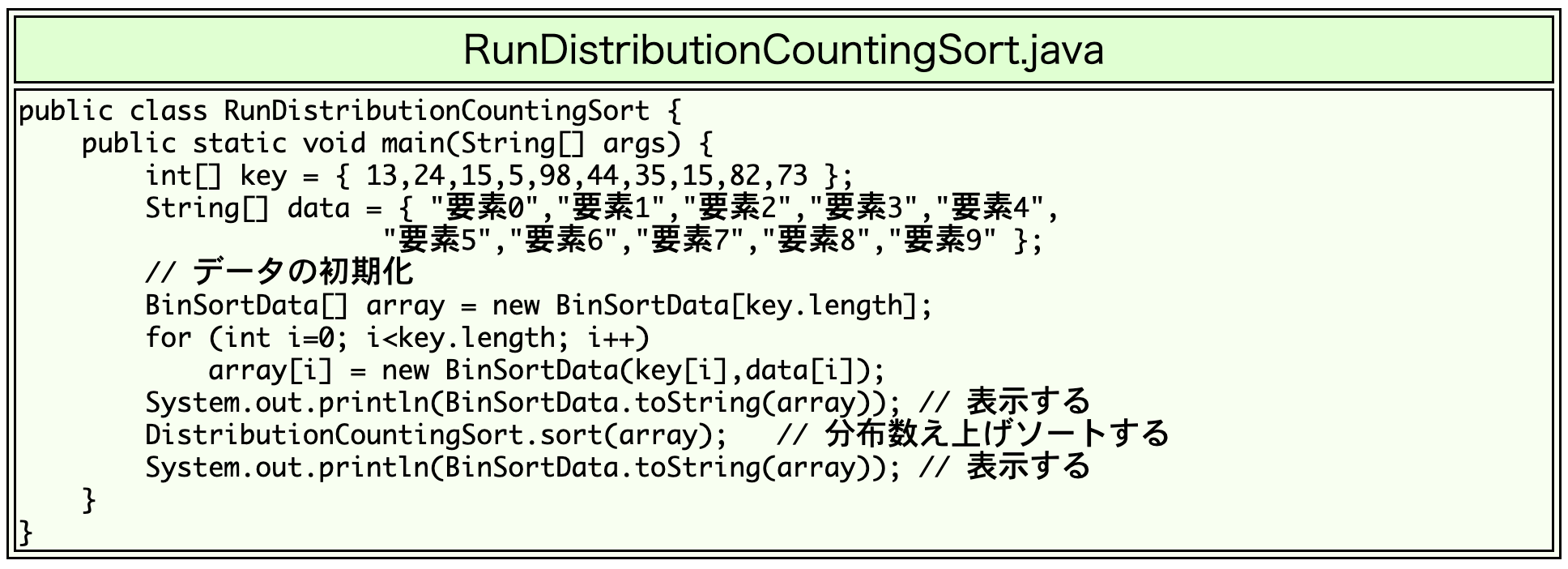 [注意] DistributionCountingSortクラスは BinSortDataオブジェクトの 配列をソートしますが、今回扱うデータは整数値のみです。 そこで、データをkeyフィールドに保存し、dataフィールドには keyと同じ値のIntegerオブジェクトを入れておけばよいものとします。