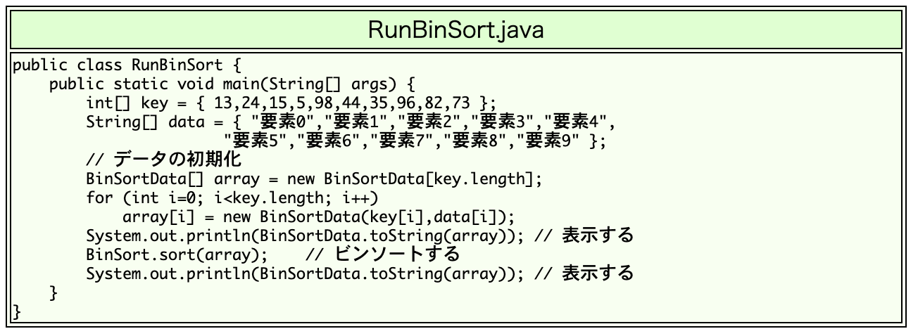 上記の BinSortData.java, BinSort.java, RunBinSort.java を自分で入力し、 動作させてみましょう。 動作を確実に理解して下さい。