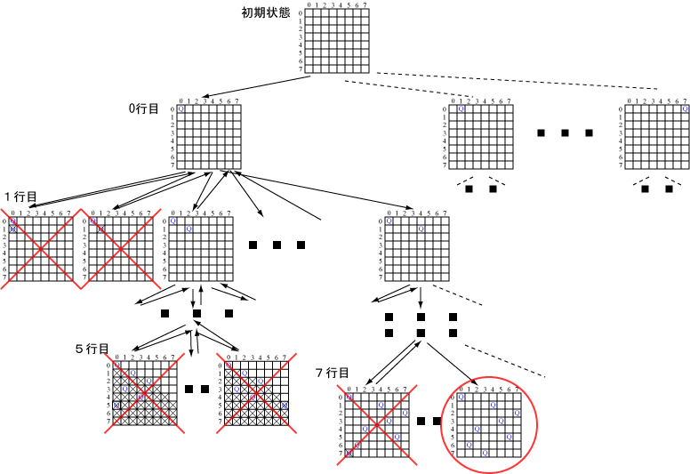 8-Queenの解を求めるには、8個のQueenを順番に盤の各行に配置してみて、 条件を満たしているかどうかをバックトラックしながら 調べることになります。
