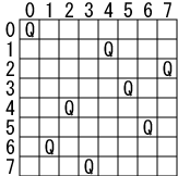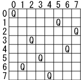 8-Queen問題の解は何通りもありますが、2つ程例を挙げておきます。 Queenが、それぞれの利き筋をはずして置かれていることを確認して下さい。