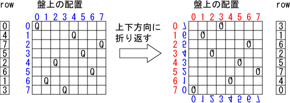 このプログラムは、解を発見したときに、そのまま完全一致でない盤面 (回転や折り返しによって同じ盤面となる盤面)を別物として扱い、 重複して数えることになります。