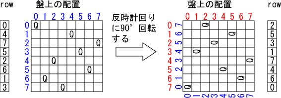 盤上の各行に置かれたQueenの状態を、変数row(整数の配列)で 表現します。