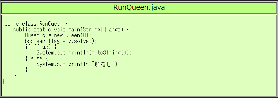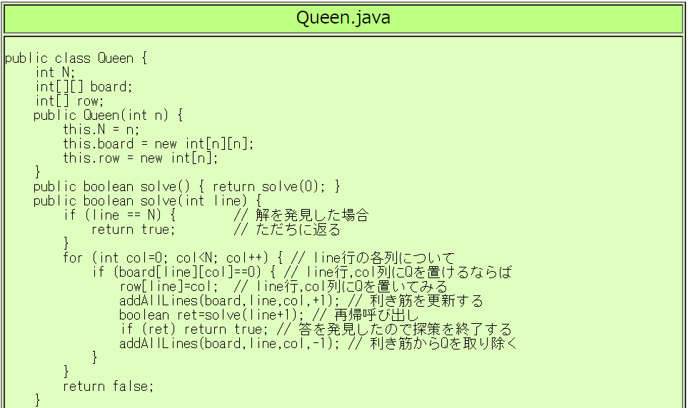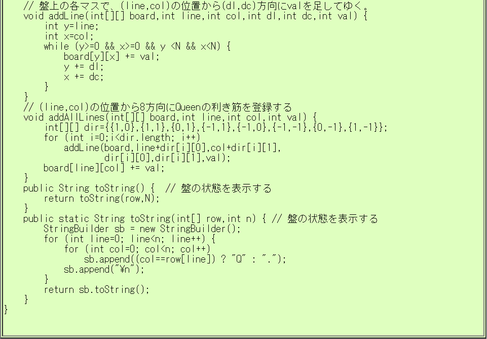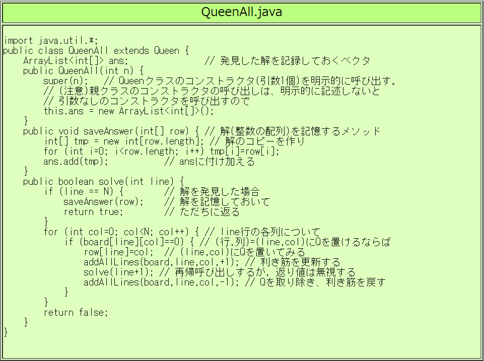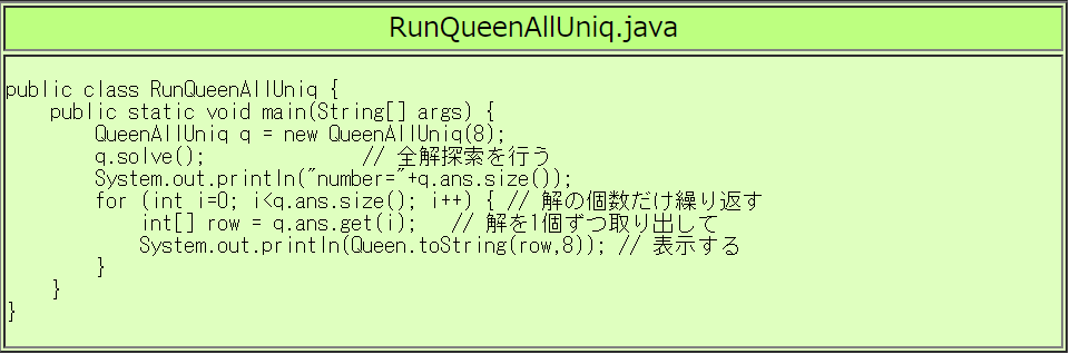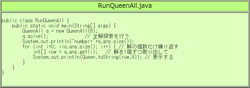 RunQueenAll.java を動作させて、解が全部で何個あるかを確かめて下さい。 RunQueenAll.javaを動作させるためにはQueenAll.java, Queen.java も必要になります。