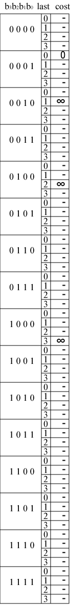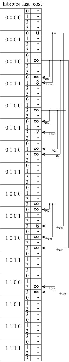 既に訪れたノード群をn bit幅のビットパターンで表現することにします。 すなわち、 bn-1 ... b2 b1 b0 において「右からi 番目のビット bi の値が、 ノードi を訪れたかどうかを表す(訪れれば1,訪れていなければ0) ものとします。 また、最後に訪れたノードをlastとして、整数で保持します。 このbn-1 ... b2 b1 b0と last の組を bn-1 ... b2 b1 b0:last と表記することにします。