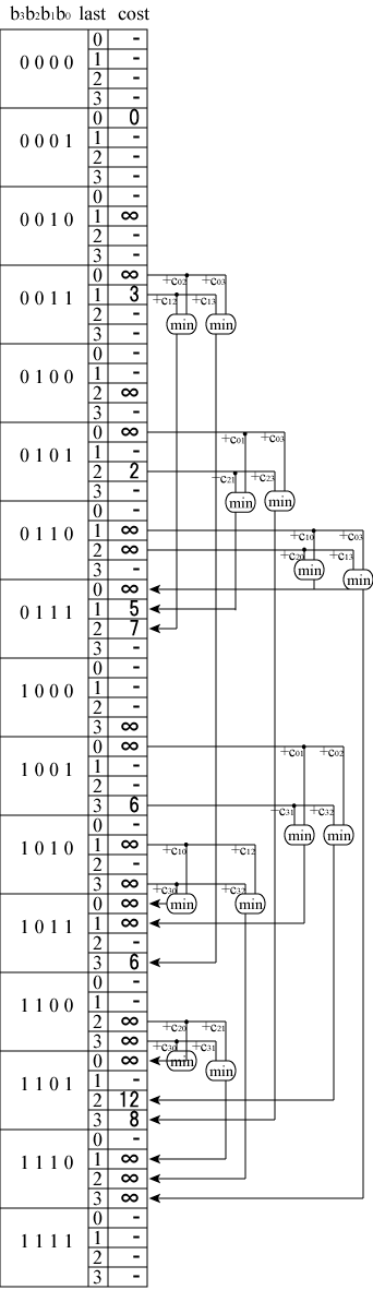 | 図12: 訪れたノードがk-1個の状態から、k個の状態の最小コストを求める | ||||