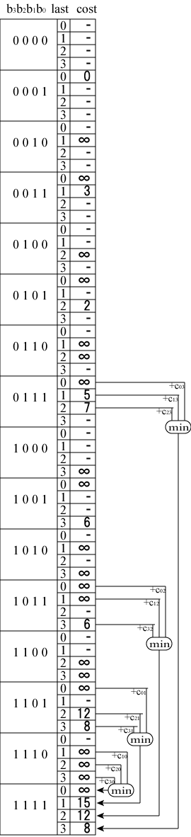 ノードを2つだけ訪れた状態を使って、ノードを3つ訪れた各状態に至る最小コストが 計算できます(図12(c))。