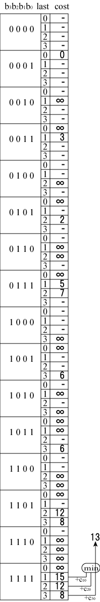 ノードを3つだけ訪れた状態を使って、ノードを全て(4つ)訪れた各状態に至る 最小コストが計算できます(図12(d))。 図12(d)の中の、ノードを全て訪れた状態である 1111:1, 1111:2, 1111:3 のコストに、エッジのコスト c10, c20, c30 をそれぞれ加えた中から最小値を探せば答となります。