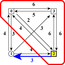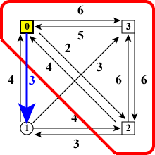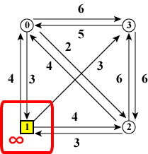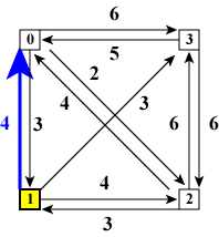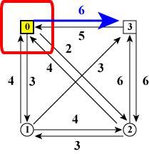ノード0はスタートノードですから、ノード0, 2, 3 を回った状態で ノード0からノード1にくることは実際にはありえないのですが、 ここでは説明やプログラムを簡単にするためスタートノードも 入れて考えておきます。