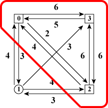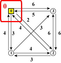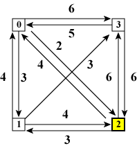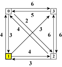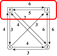 巡回セールスマン問題の例として、 4個のノードが有向エッジで連結された図1のグラフを考えましょう。 ノード0からスタートして、全てのノードを経由してノード0に戻ってくる 経路は、図2(a)〜(d)に示すように4通りあります。 図では「まだ訪れていないノード」を「丸」で、 「既に訪れたノード」を「四角」で表しています。