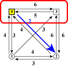 図6の3種類のうち、例として、 図6(b)「ノード0,2,3を訪れたときノード2が最後」の状態を詳しく見ていきましょう。 この状態を実現するためには「ノード0,3を訪れた状態」からノード2に移動する 必要があります(図7, 強調のため既に訪れたノード群を赤線で囲んでいます)。