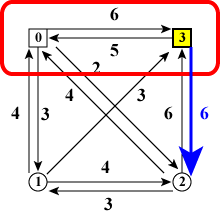 「ノード0,3を全て訪れた状態で、最後に訪れたノードがx のコスト」