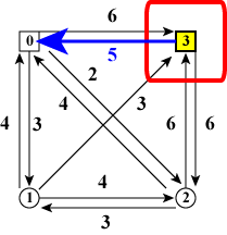 図8(a)の状態になるには、図9のように 「ノード3だけを訪れている状態」からノード0に移動する 必要があります。 しかし、これはすなわち図11(d)の「ノード3からスタートする」 という状態なので条件を満たしません。 不可能な状態のコストは無限大と考えます。