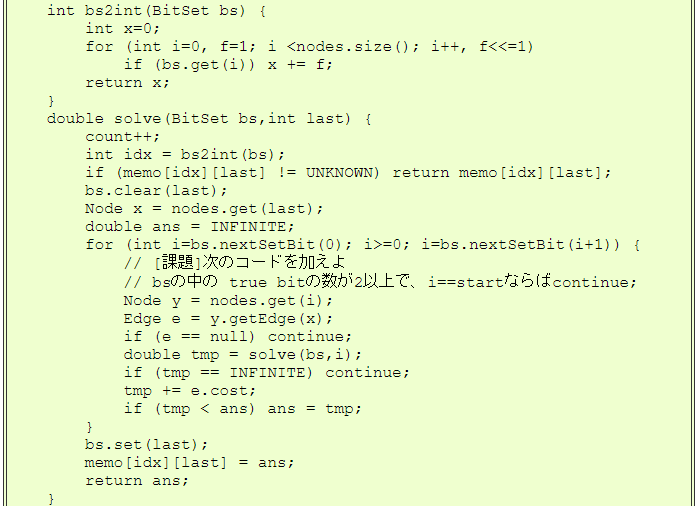プログラム中の注釈で示してある変更を加えなさい。 変更後のプログラムで、ts10_data.txt, ts16_data.txt, ts18_data.txt を処理したとき、double solve(BitSet,int) メソッドの 呼び出し回数 (= -vオプションをつけて実行したときのcountの値) がそれぞれ何回になるか答えなさい。