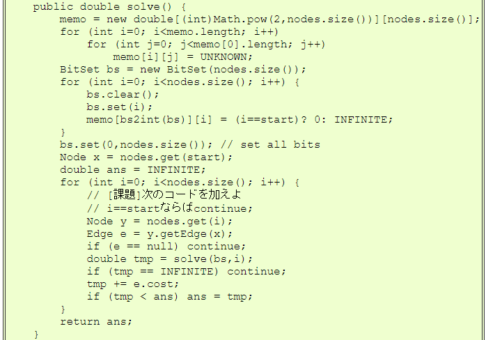 | コメント欄: | 変更後のプログラムで、ts10_data.txt, ts16_data.txt, ts18_data.txt を処理したとき、double solve(BitSet,int) メソッドの 呼び出し回数がそれぞれ何回になるか答えなさい。 |