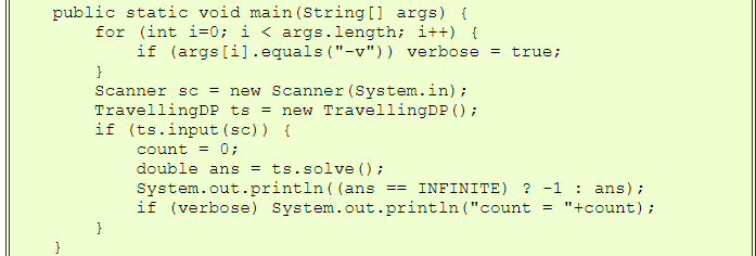 $ javac TravellingDP.java $ java TravellingDP < ts4_data.txt 13.0 $ java TravellingDP -v < ts4_data.txt 13.0 count = 15 |