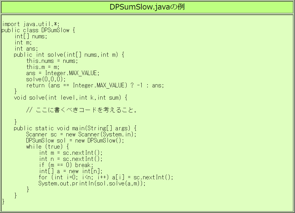 | コメント欄: | dpsum02.txtを入力としたとき、DPSumSlow.javaの出力 |