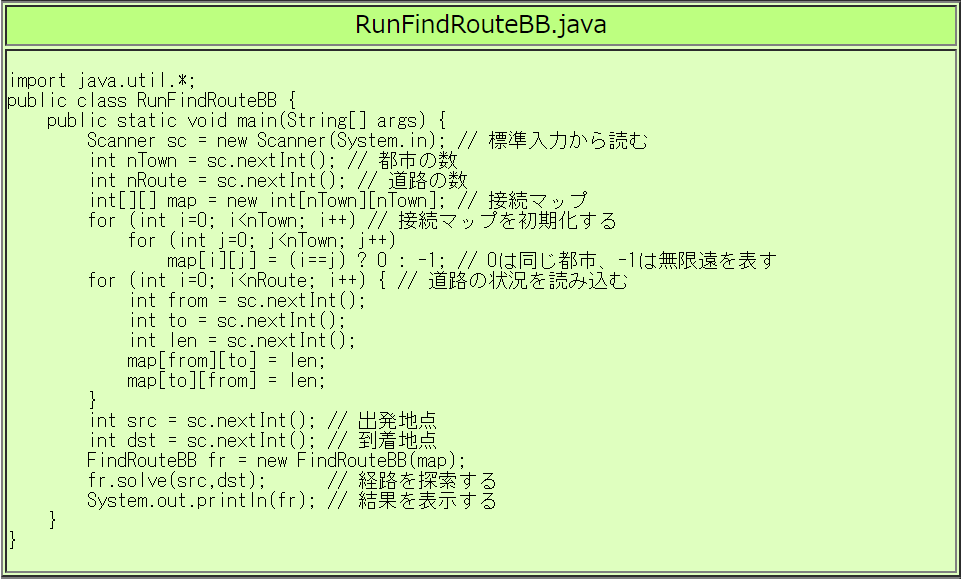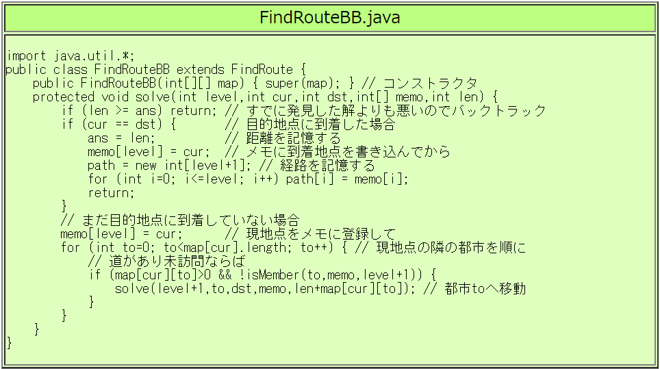 FindRouteBB.java を変更して、「FindRouteBBクラス中の5引数のsolveメソッドが 何回呼び出されたか」を結果の表示のときに表示するように変更して下さい。