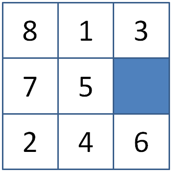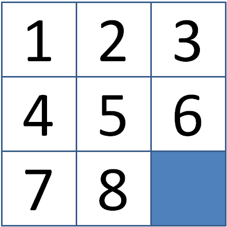 3×3のボードの上で8枚の駒を、空いたマス目を利用して動かし、目的の形にするパズル。 空白部に隣接する駒をスライドすることで盤面を操作する。