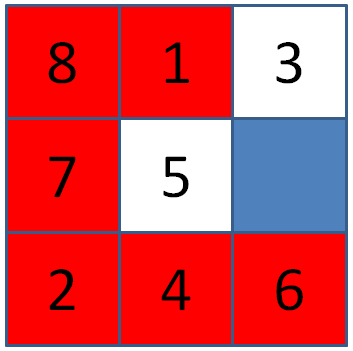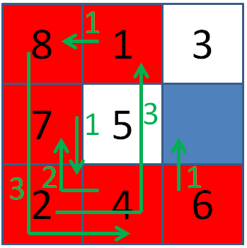 位置が正しくないパネルの、正しい位置までのマンハッタン距離の和。 下の例では h* (x) = 1 + 1 + 1 + 2 + 3 + 3 = 11。