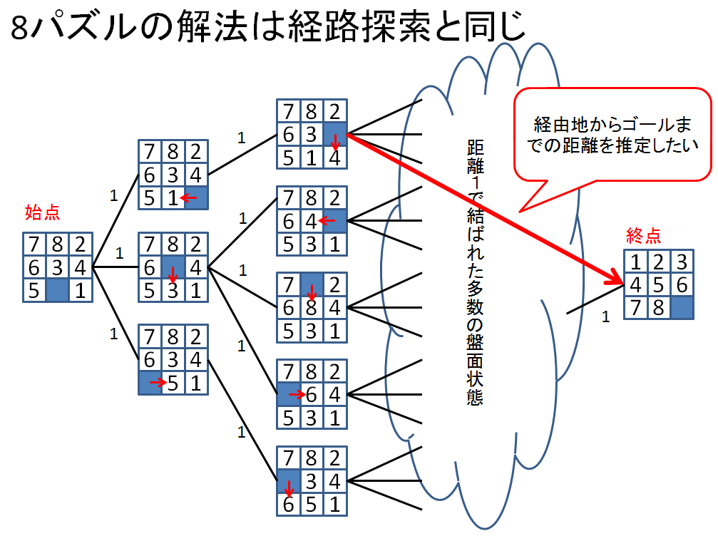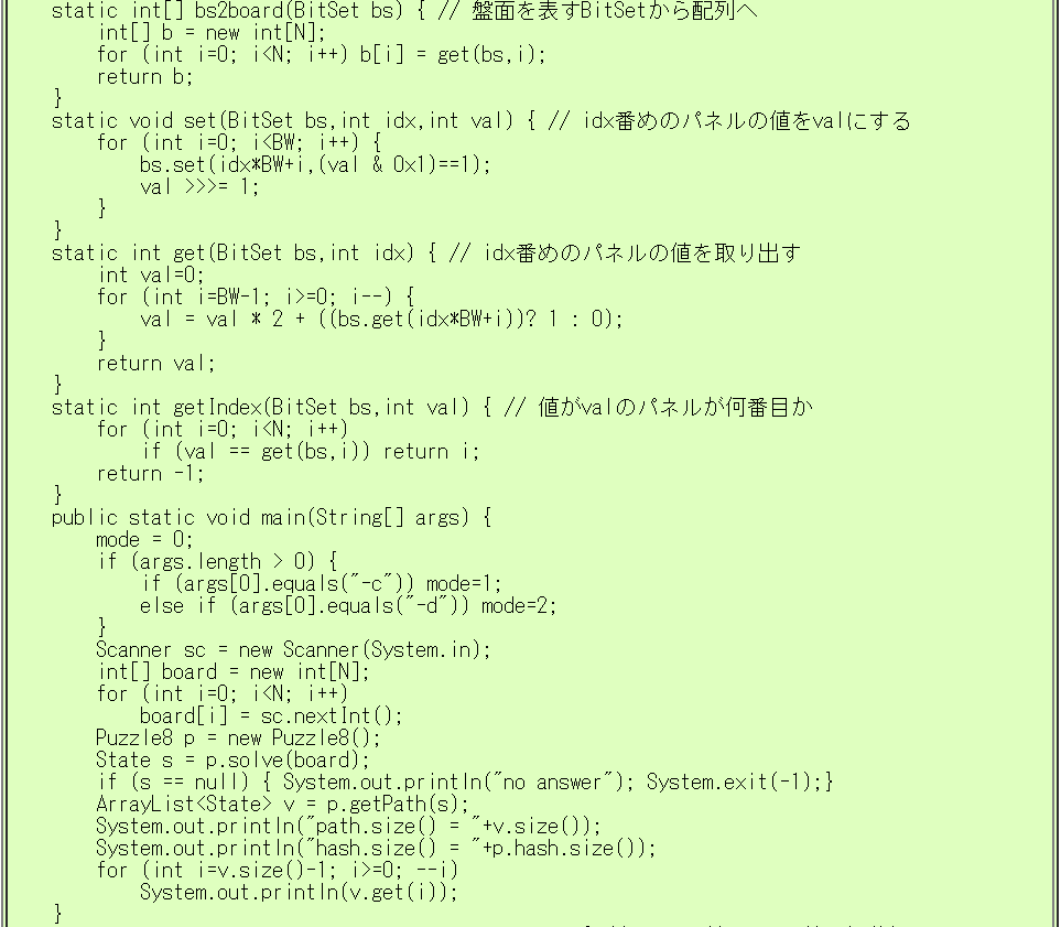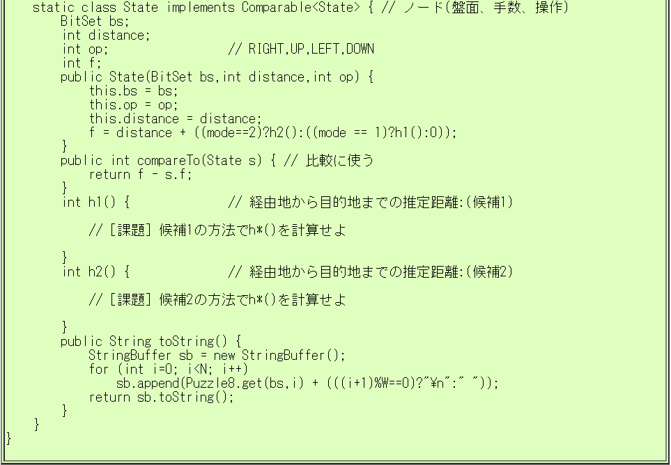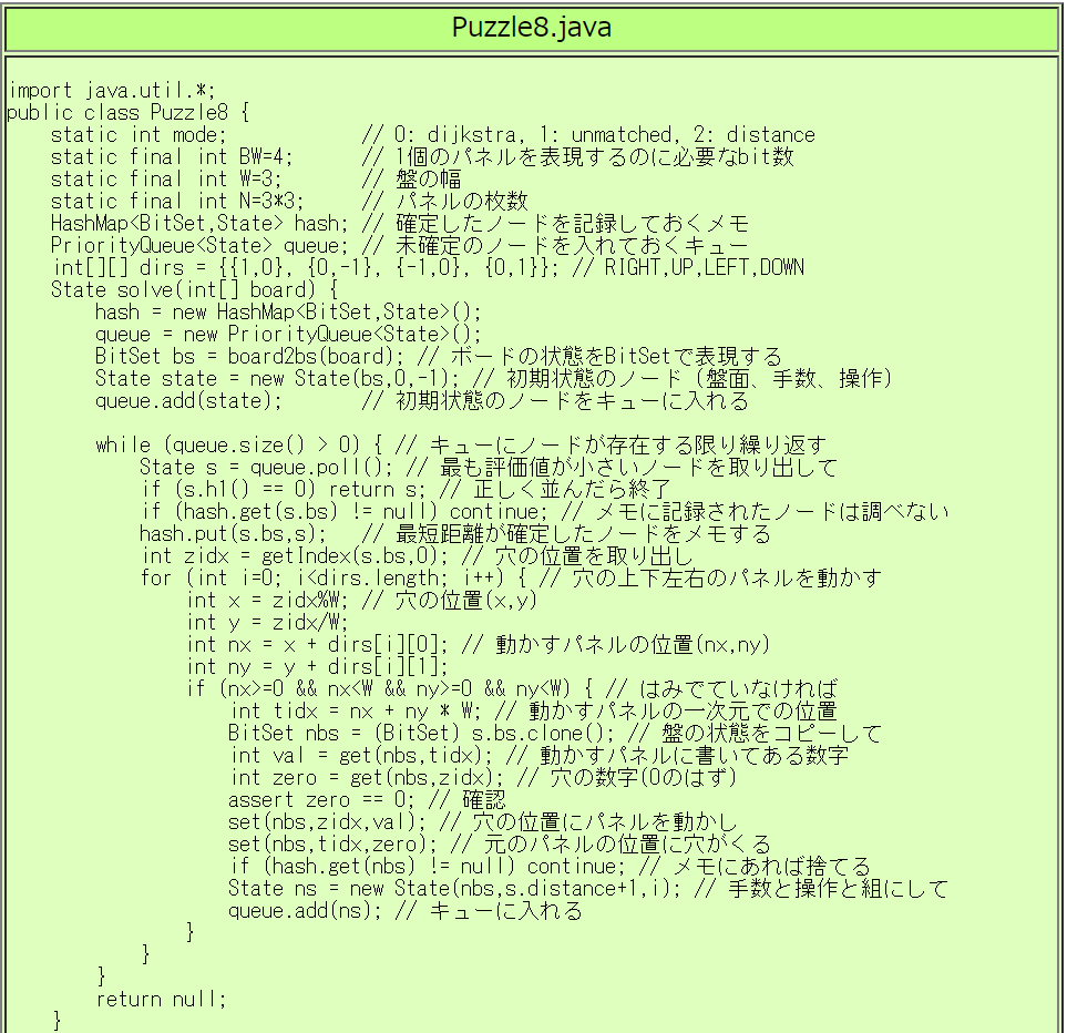 正しく並んだ解を得るまでの最小の手数を求めるプログラム Puzzle8.java の 抜けている部分のコードを自分で書きなさい。