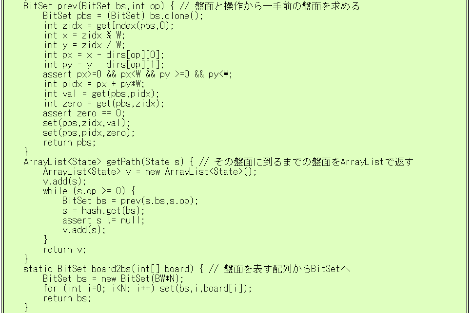 $ javac Puzzle8.java $ java Puzzle8 < data01.txt path.size() = 6 hash.size() = 57 1 2 3 7 4 6 5 0 8 1 2 3 7 4 6 0 5 8 1 2 3 0 4 6 7 5 8 1 2 3 4 0 6 7 5 8 1 2 3 4 5 6 7 0 8 1 2 3 4 5 6 7 8 0 $ java Puzzle8 -c <data01.txt path.size() = 6 hash.size() = 7 ...(略)... $ java Puzzle8 -d < data01.txt path.size() = 6 hash.size() = 6 ...(略)... |