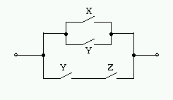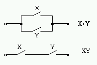 リレー接点を用いた論理回路では接点が閉じていることを "1" に、 開いていることを "0" に対応させます。 ブール代数によるリレー回路の表現の例を以下に示します。