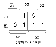 $G$ の $X_{1}$, $X_{2}$, $X_{3}$ にそれぞれ 0,1を代入すると $G(0,0,0)=G(0,0,1)=G(0,1,1)=G(1,0,0)=G(1,1,0)=G(1,1,1)=1$となるから $G(X_{1},X_{2},X_{3}) = \bar{X_{1}} \bar{X_{2}} \bar{X_{3}} + \bar{X_{1}} \bar{X_{2}} X_{3} + \bar{X_{1}} X_{2} X_{3} + X_{1} \bar{X_{2}} \bar{X_{3}} + X_{1} X_{2} \bar{X_{3}} + X_{1} X_{2} X_{3}$ |