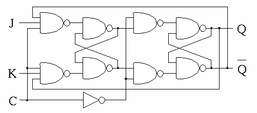 上に示した「マスタースレーブ形のJKフリップフロップ」の回路では クロックによって第1のセルに入力を与え、これを反転したクロックで 第2のセルに入力を与えています。 したがって、Qの出力情報が現れるのはクロックの立ち下がり時です。 クロックの立ち下がりで動作するという意味でクロックに負論理の記号を 付けて表します。