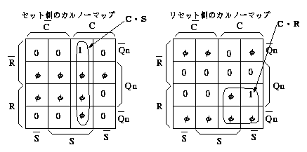 特性表を用いて、「セット」「リセット」の部分に接続する回路の カルノーマップを書くと以下のようになります。