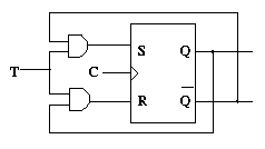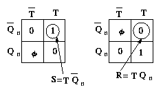 カルノーマップを用いて、以下のような変換回路をつけると SR フリップフロップから Tフリップフロップが得られることがわかります。