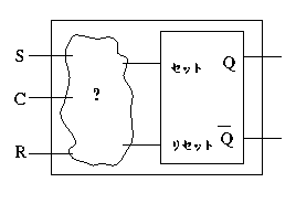 非同期式のSRフリップフロップは上記のように書けるので、下図の"?"の 部分の回路を設計すればよいことになります。